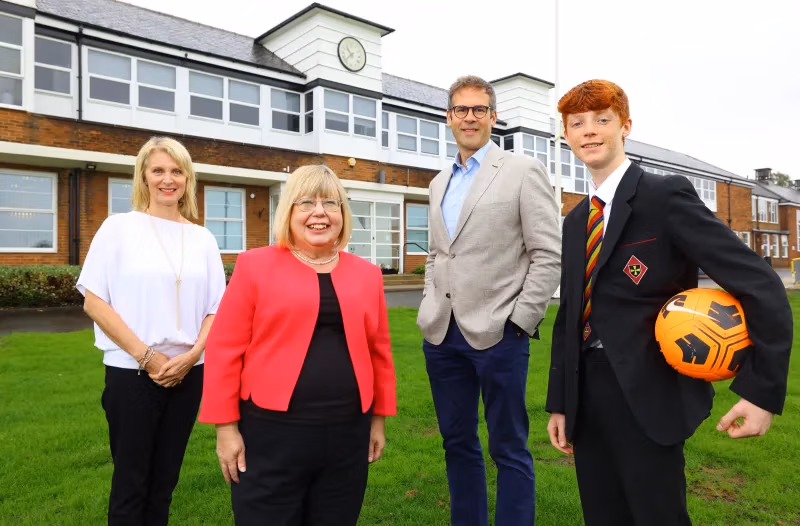 Above: (L-R) Marie Difalco. MP Liz Twist, Dame Allan’s Principal Mr Will Scott and pupil Marcus